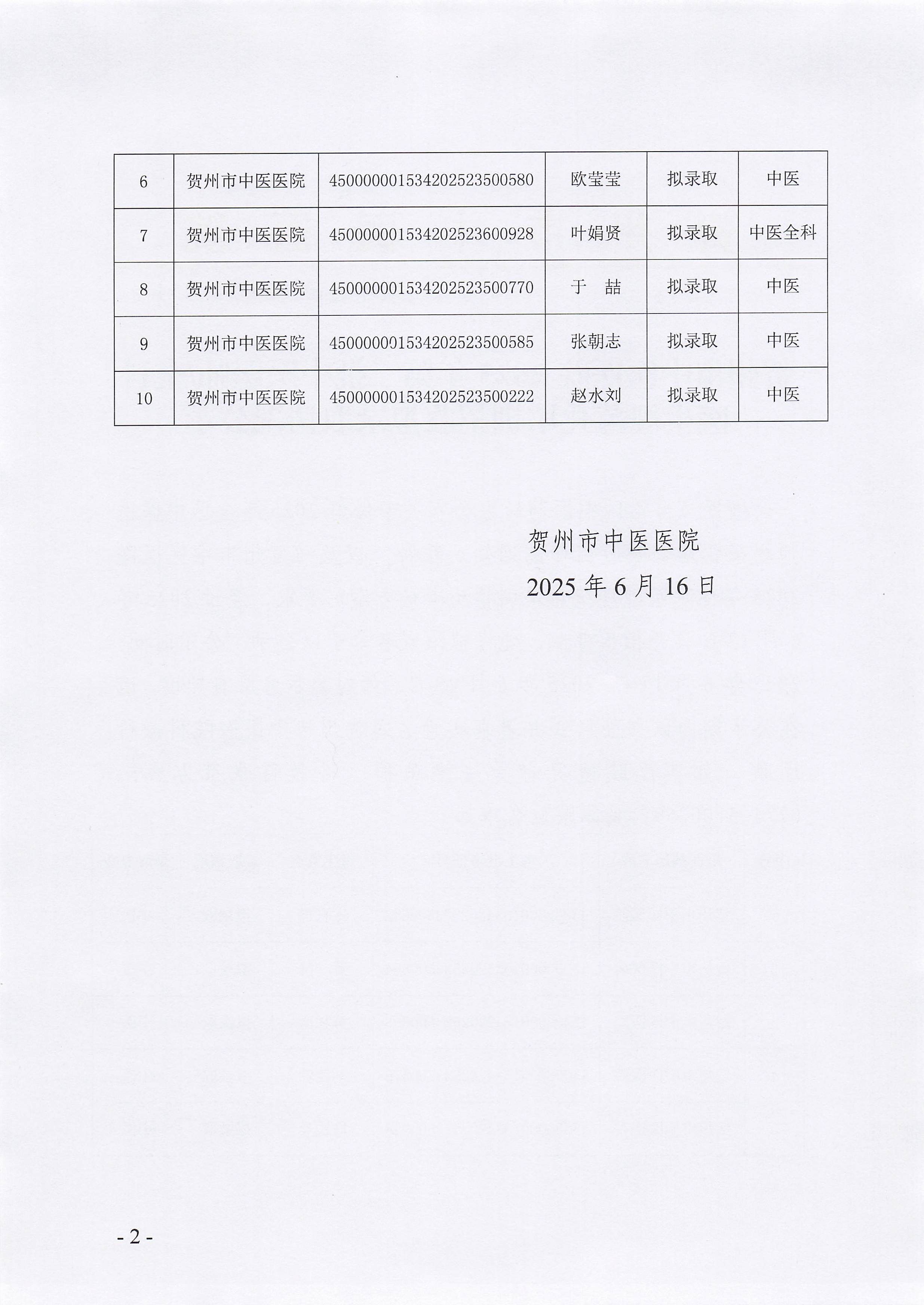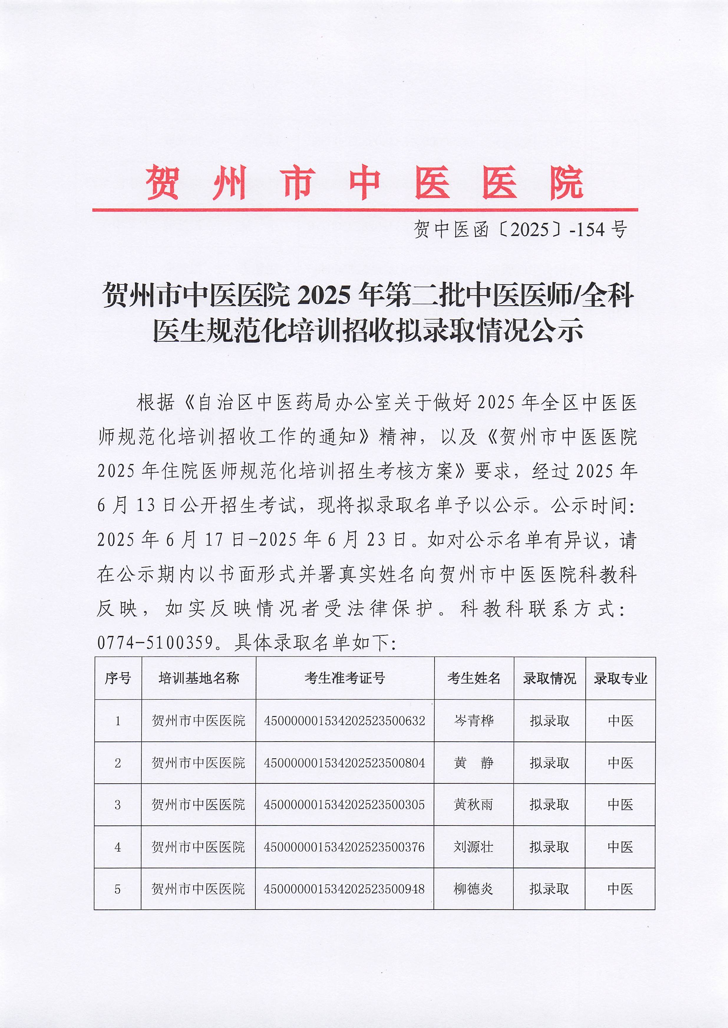贺州市中医医院2025年第二批中医医师/全科医生规范化培训招收拟录取情况公示
