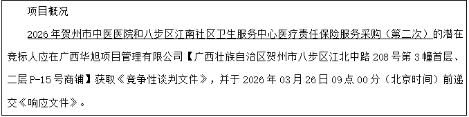 采购需求:2026年贺州市中医医院和八步区江南社区卫生服务中心医疗责任保险服务采购,如需进一步了解详细内容,详见竞争性谈判文件。