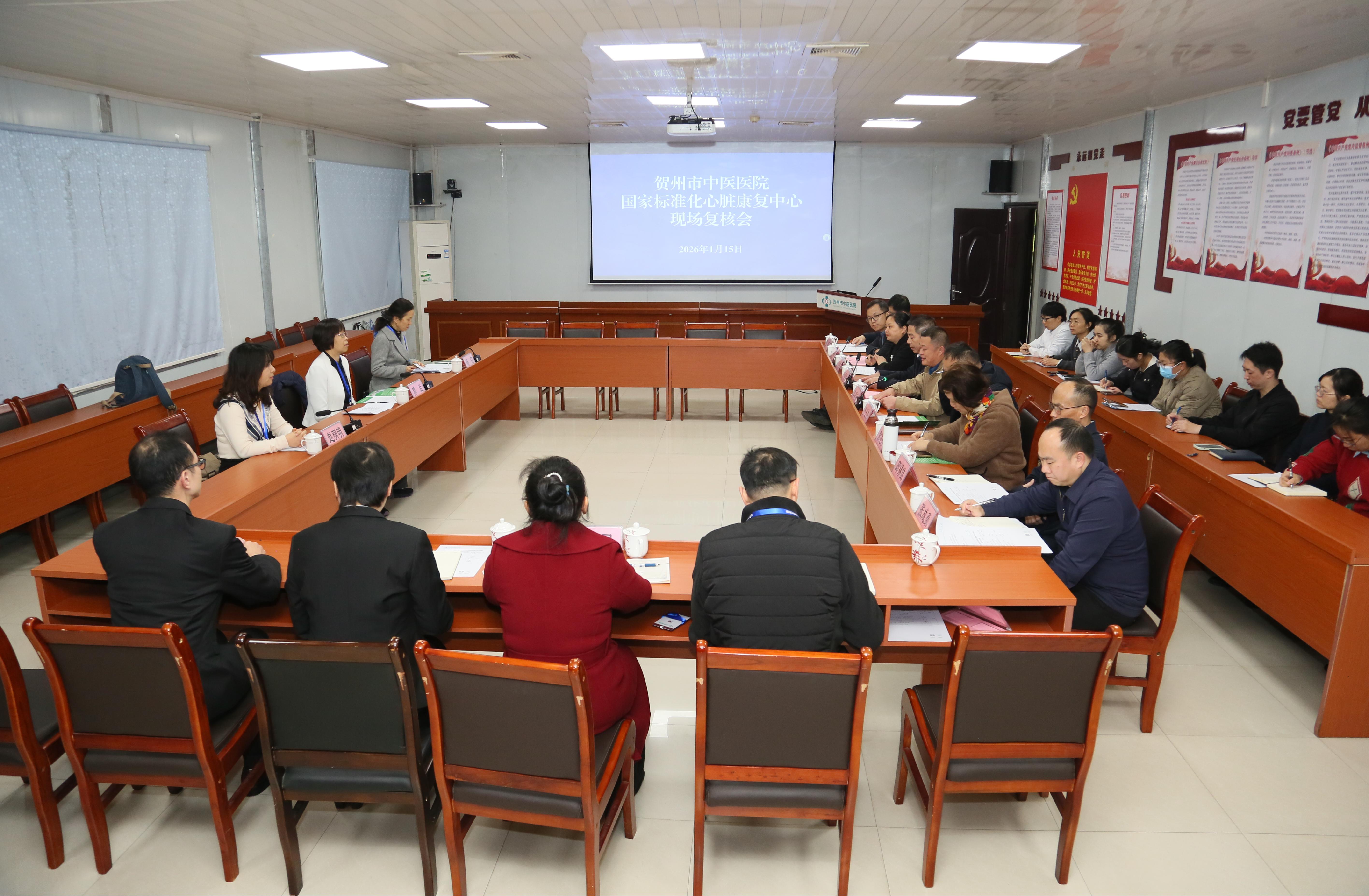 1月15日,贺州市中医医院接受国家标准化心脏康复中心现场复核。来自国内心脏康复领域的广东省人民医院郭兰教授、云南延安心血管医院杨莉教授、广西壮族自治区人民医院赵明明教授到院指导。市卫健委党组成员、市疾控中心主任李建标,市中医医院党委书记严汝庆、院长宁锦龙、在家领导班子,以及心脏康复团队成员出席会议。、